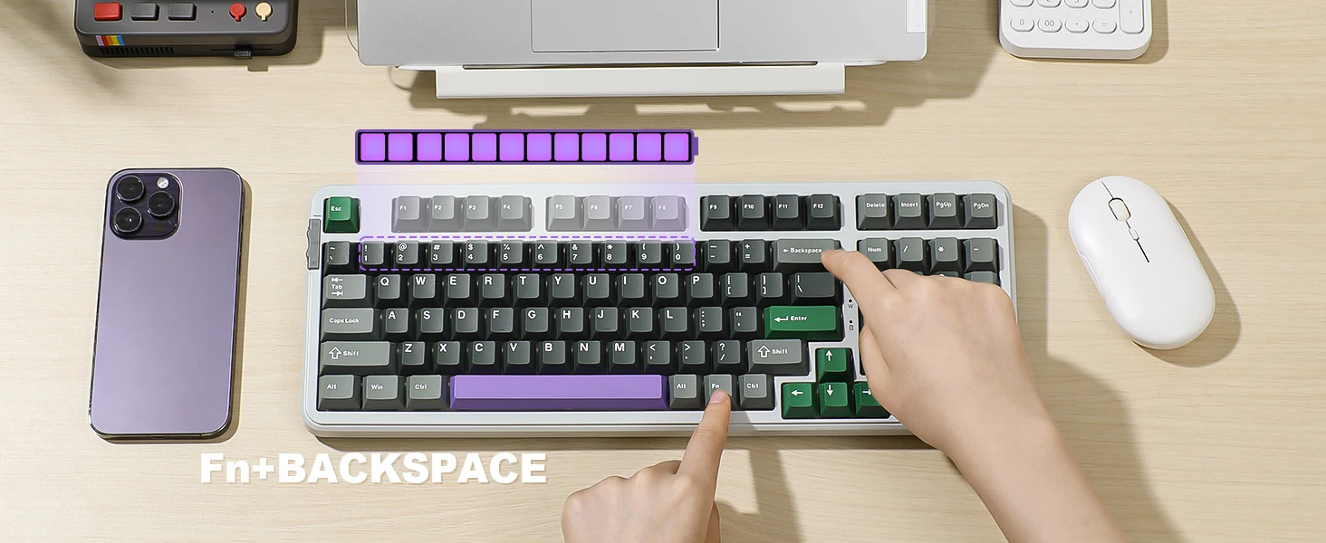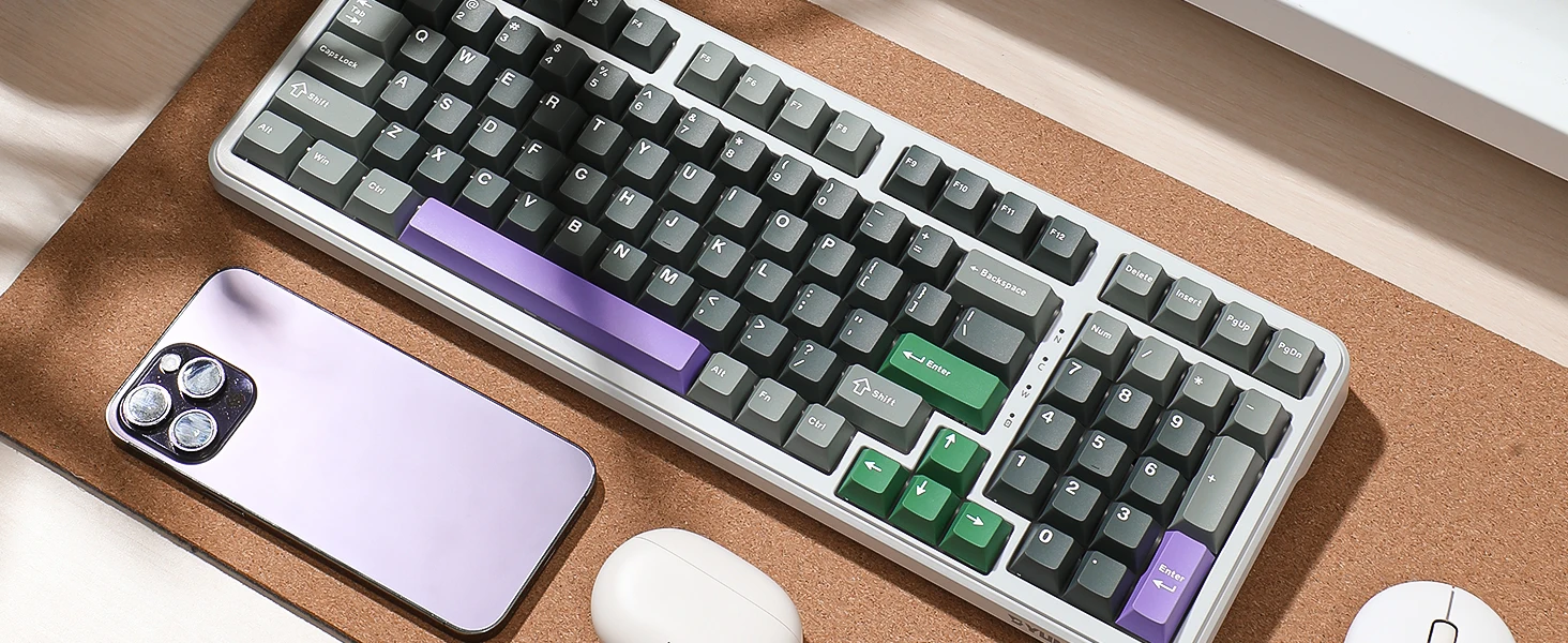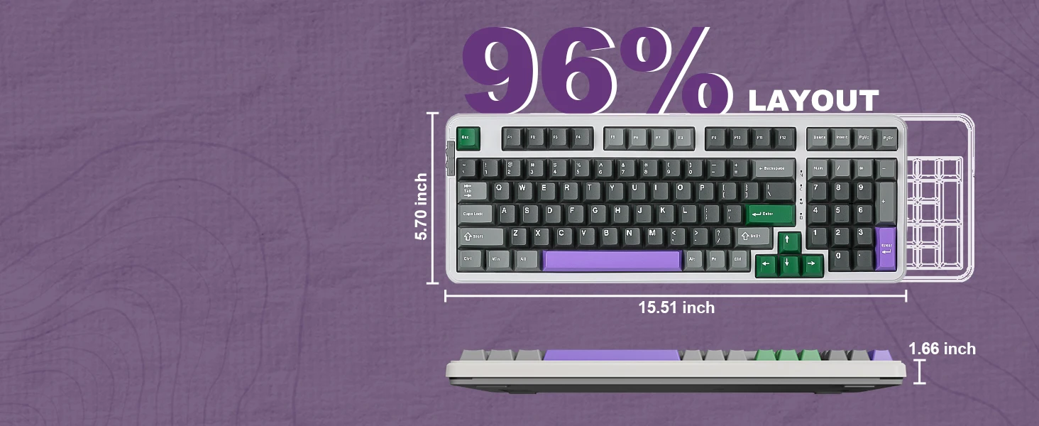 B98 is a premium mechanical keyboard with a num pad, function Fn keys, and shortcuts, which are essential for both work and gaming needs. Unlike the full-size keyboard and TKL keyboard, the 96% layout keyboard saves more space on your desk while keeping the arrow keys and number keys. The wireless keyboard comes with quality PBT Cherry profile keycaps that aim to provide a more comfortable fingertip feel with excellent oil resistance for long-term use. The ergonomic design and stylish color scheme, add a nice aesthetic touch to the desk setup.