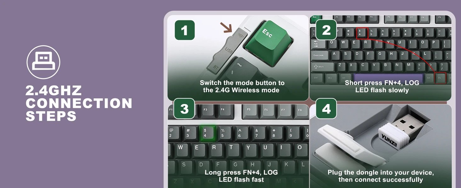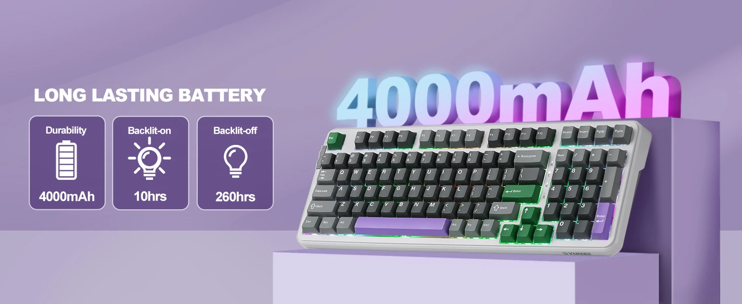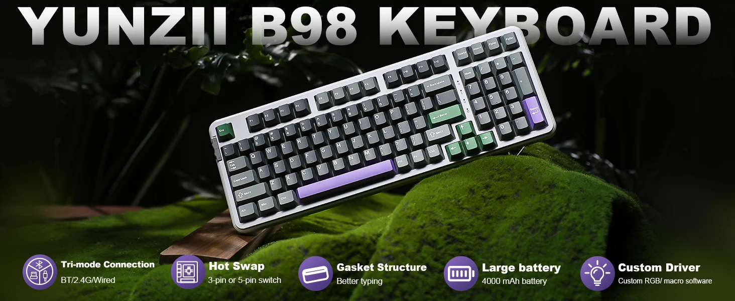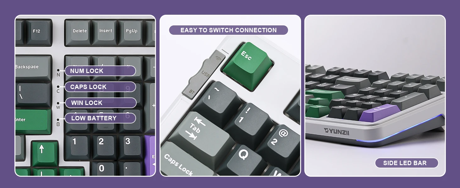 YUNZII B98 wireless mechanical keyboard has 3 connectivity options, Bluetooth, wireless, and wired. It can connect up to 5 devices simultaneously and quickly switch between them easily by FN shortcuts. The default shortcuts to easily switch Windows and macOS layouts, fully compatible with Mac and Windows. You can also enjoy the wired connection with a 1000 Hz polling rate. The built-in large capacity 4000mAh battery ensures long-lasting wireless connection, portable keyboard needs, and fast charging, providing great flexibility whether using it at a desk or with a laptop on the go.