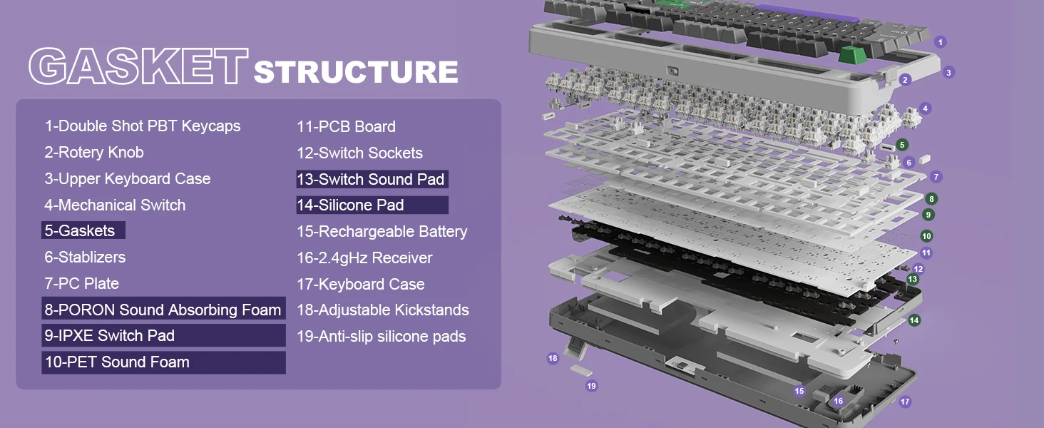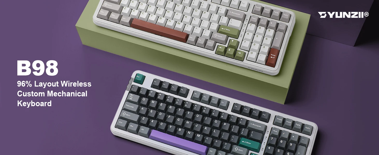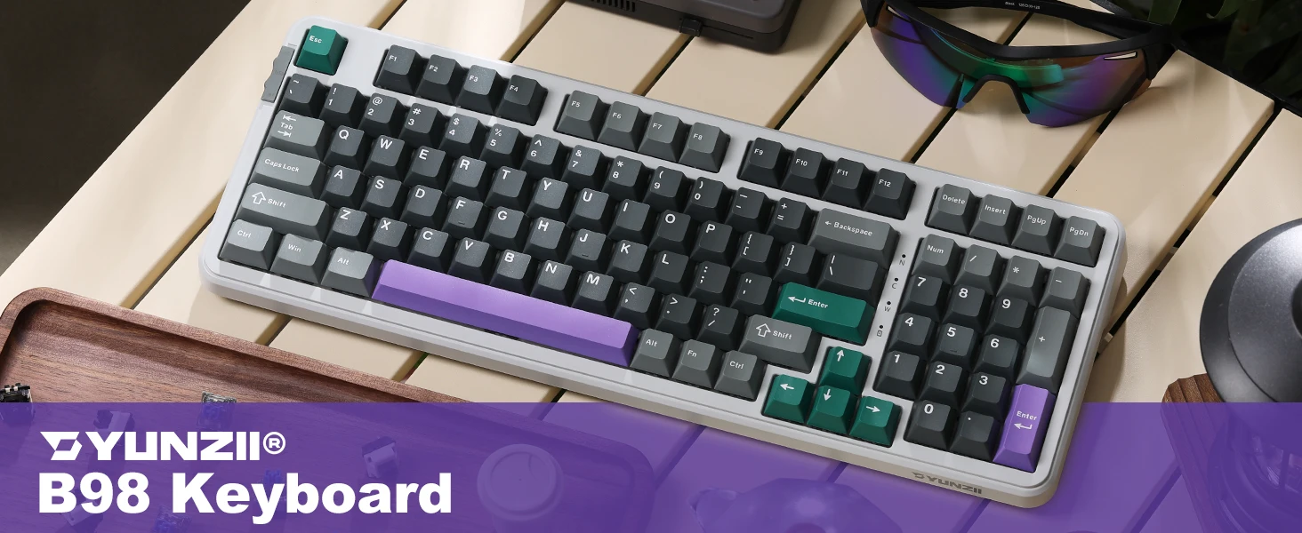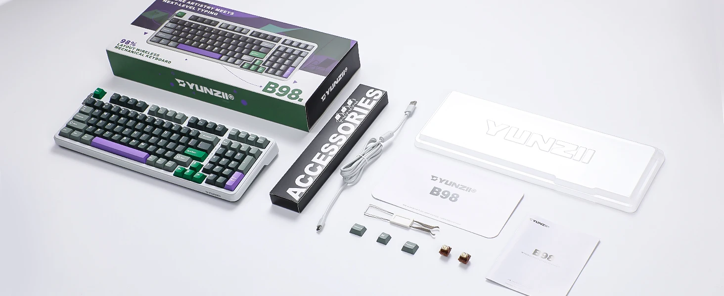 YUNZII B98 takes factory gaskets and pc plates, ensuring a softer typing experience and more elasticity for each keystroke, making it very solid while still retaining good flex when typing. The gasket keyboard has built-in 5-layer sound-absorbing pads, incorporating PORON sound-absorbing cotton, IXPE under-switch pads, PET sound pad, cotton pad, and silicone bottom padding, which contributes smoother and solid sound with reduced sound and shock.