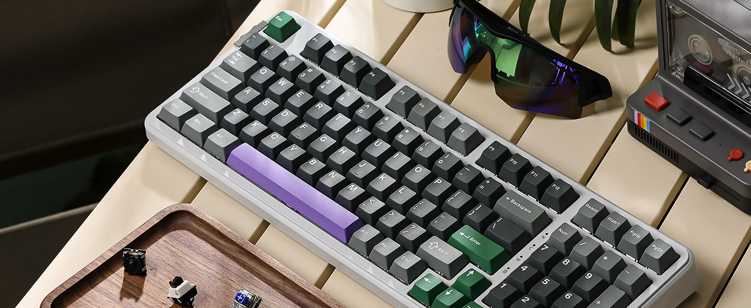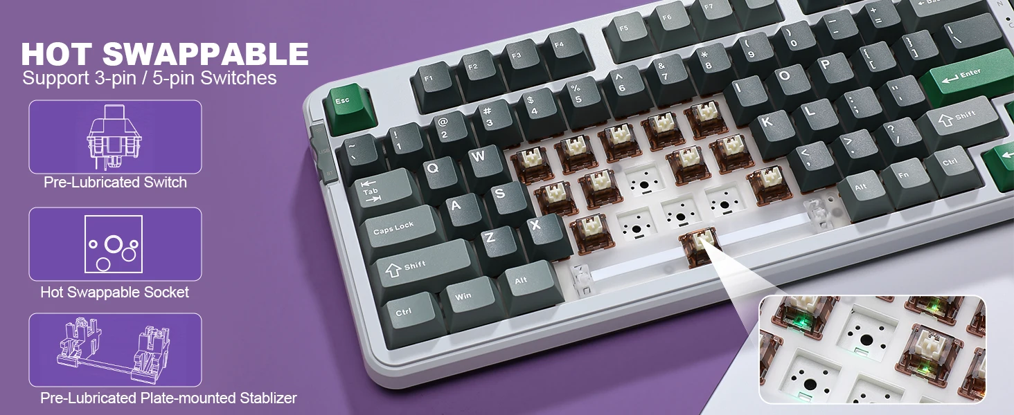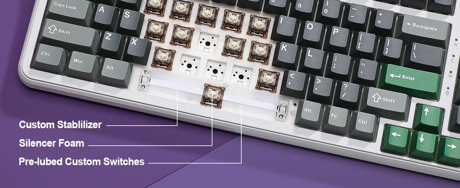 B98 creamy keyboard is hot-swappable, so you can hot-swap every switch on the keyboard with almost all of the 3pin and 5pin MX style mechanical switches (including Cherry, Gateron, Kailh, etc.) without soldering, making it easy to customize the keyboard to different preference without any hassle. The pre-lubed linear switches sound creamy and thocky, and finely-tuned stabilizers and effortless actuation points of the keys make gaming and typing feel more fluid.