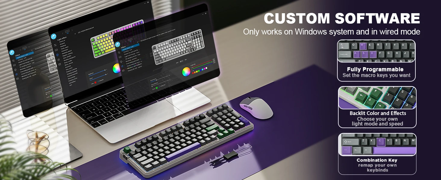 The RGB keyboard comes with 19 default color combos and 8 backlight colors. It has south-facing LEDs and RGB on the keyboard both front and sides. The keyboard backlight colors are vibrant and you can adjust it to your liking by shortcuts, adding a great atmosphere to the game room. The B98 custom Keyboard has programming software that you can create your own preset, RGB effects, custom keys, Macro recording, etc. N-key rollover, the keyboard can respond to multiple key presses at the same time, greatly improving game operability and efficiency.